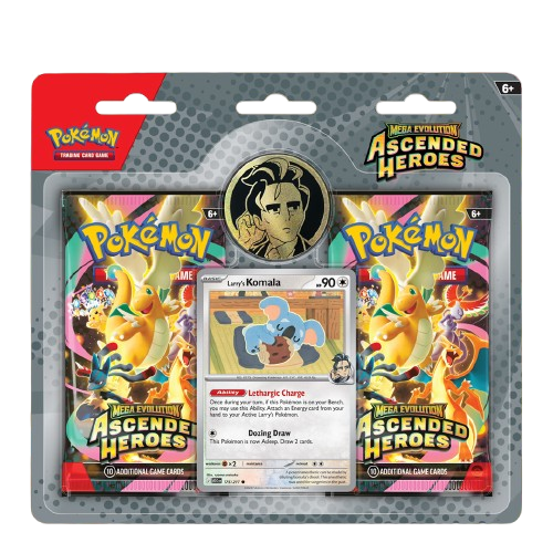 W tym zestawie znajdziesz kartę promocyjną przedstawiającą Erika’s Tangela lub Larry’s Komala, metaliczny żeton z wizerunkiem wybranego Gym Leadera oraz dwa boostery z dodatku Pokémon TCG: Mega Evolution - Ascended Heroes.